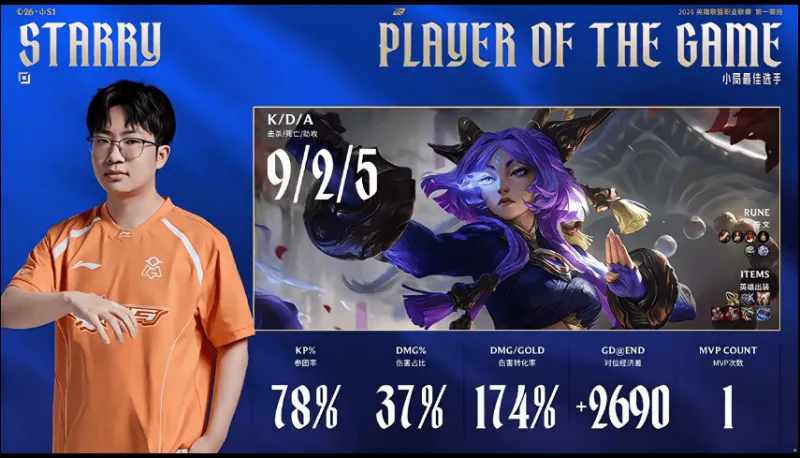 虎扑01月23日讯 在刚刚结束的OMG对阵LGD的对局中,Starry使用芸阿娜打出9/2/5战绩,斩获LGD对阵OMG第一局MVP